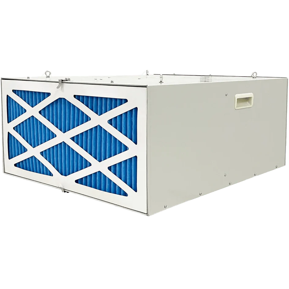 The iLiving 3-Speed Air Filtration System with remote control is designed with 2-stage filtration for handling dust and particles in high-use work areas. This versatile unit can be suspended from the ceiling, placed on the floor or sawhorses, and includes four casters for easier placement and storage.